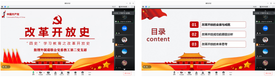 支部委员赵宏艳带领全体党员重点学习了《习近平谈治国理政》第三卷中的第七专题“形成全面开放新格局”。赵宏艳以浦东开发,中国国际进口博览会,中国自贸区的扩容为例,按照改革开放的时间轴向全体党员展示了1978年以来改革开放进程中发生的影响中国格局的大事,随着时间轴的展开,党员们结合自己的实际,深切感受到了国家在经济、政治、文化、军事以及教育等各方面发生的巨大变化,切身体会了改革开放的意义、中国的改革开放能够成功的原因以及改革开放的未来。