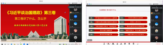 9月25日晚,数理外国语联合党委教工第二党支部线上开展学习《习近平谈治国理政》第三卷专题组织生活。会议由支部书记吴中成主持,支部全体党员参加学习。