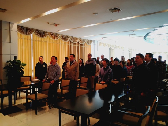 会议开始时,全场起立,共唱《中华人民共和国国歌》,党员教师也跟着全体起立。“不忘初心,牢记使命,高举中国特色社会主义伟大旗帜,决胜全面小康社会,夺取新时代中国特色社会主义伟大胜利,为实现中华民族伟大复兴的中国梦不懈奋斗。 ”豪言壮语,鼓舞人心!