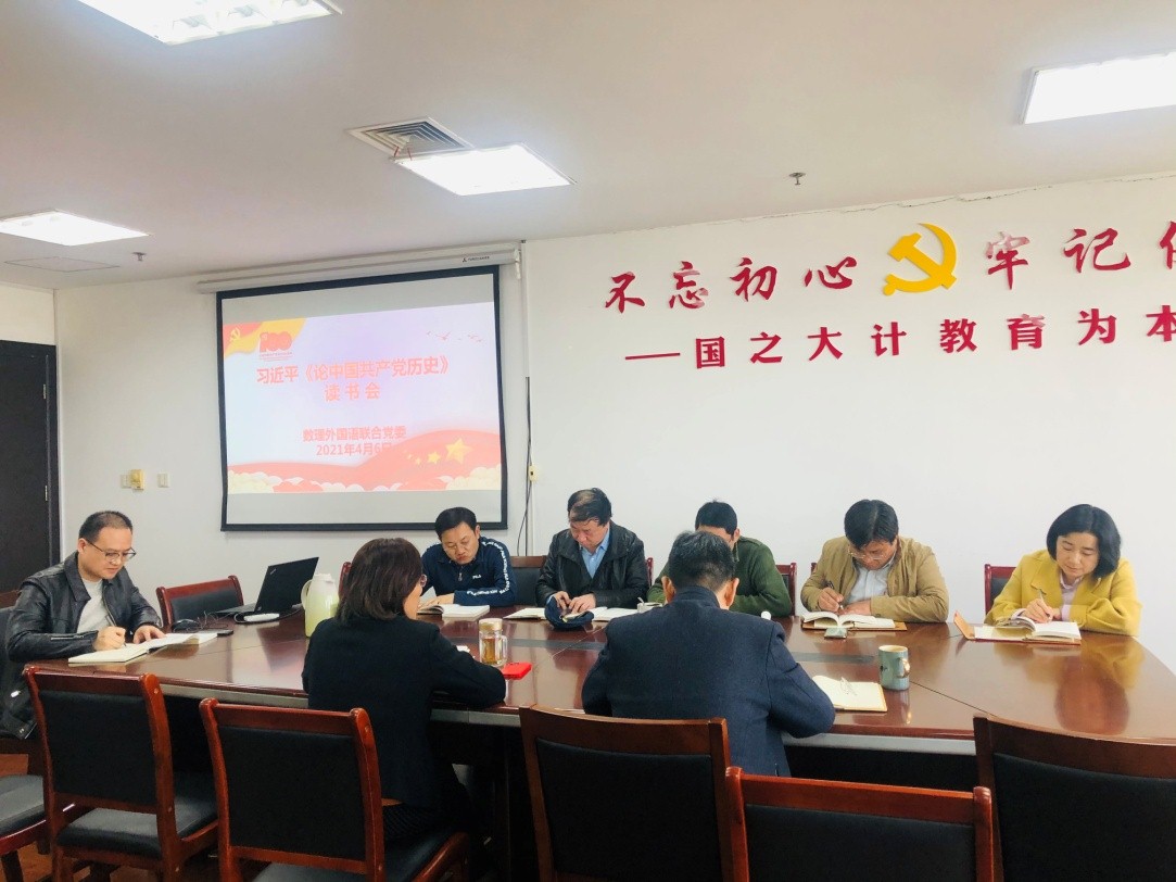 为推进党史学习教育,发挥党员干部带头学的示范作用,4月6日,数理外国语联合党委中心组开展习近平《论中国共产党历史》读书会,集体研读,深入交流,通过领读原文、讨论心得、深刻领会,在原著中获取历史的经验和前进的力量。