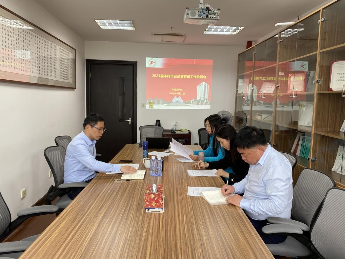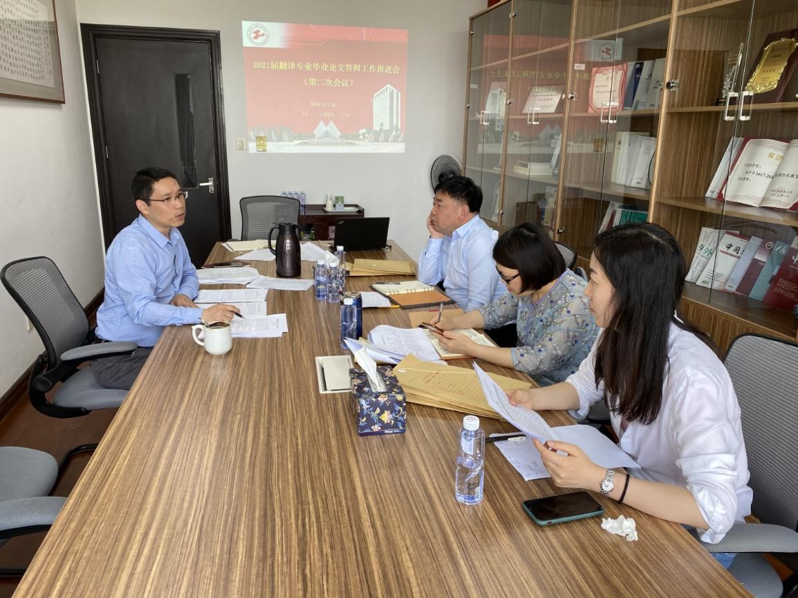 4月30日,在第二次推进会上,翻译系主任马德忠老师汇报了翻译系本科毕业论文答辩工作的组织和安排情况。刘金龙副经理着重强调了各答辩环节具体工作流程的规范化和细化优化,确保毕业答辩工作顺利进行。