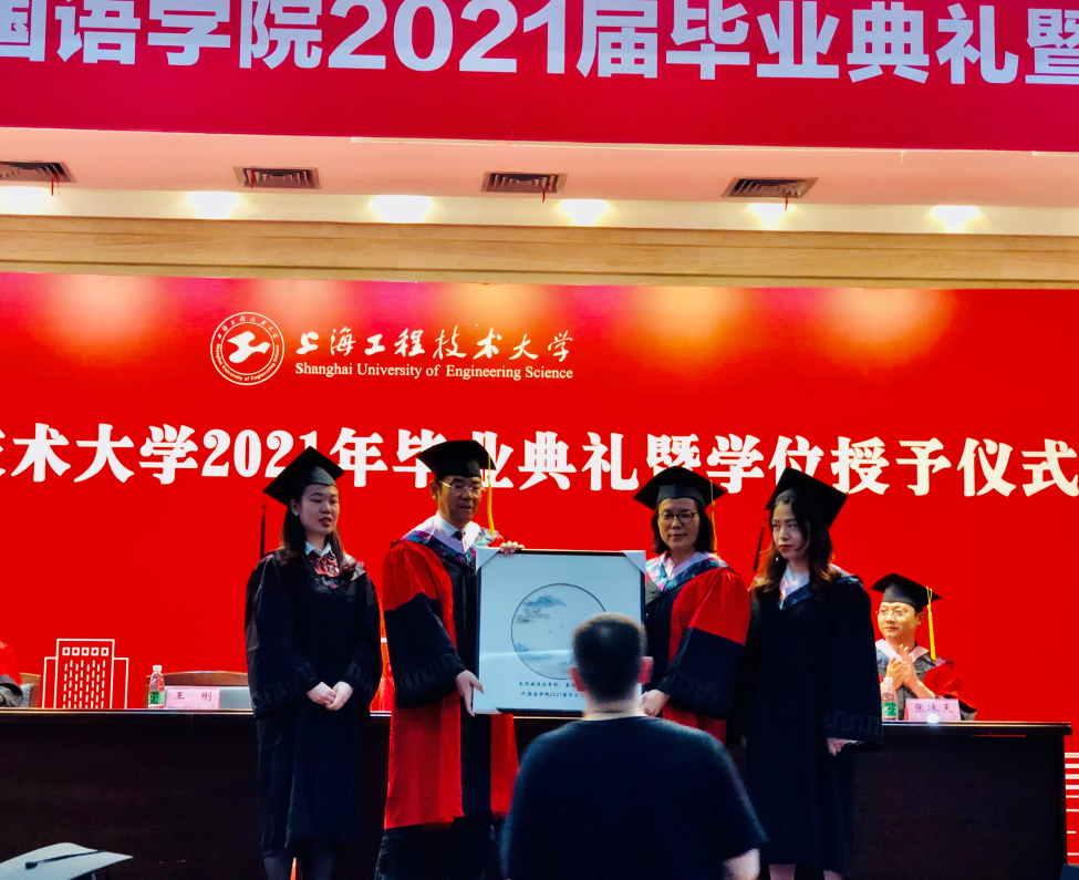 公司党委副书记、纪委书记门妍萍,联合党委书记钱慧敏、经理王刚为获得学士学位的毕业生颁证、拨穗,并合影留念。