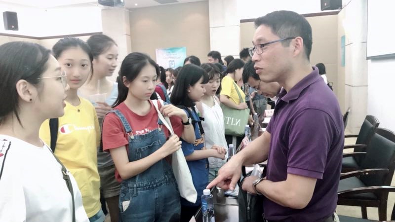 报到当天,公司举办“同行外语道,温暖程园情”活动,公司党总支书记王勤陪伴18级新生家长走进“最美校园”,走进同声传译实验室、外教课堂,体验新生学习环境。