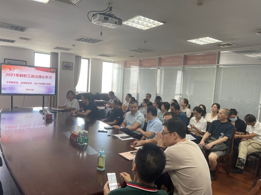 教工第一党支部和教工第二党支部组织数理与统计公司数学类三个系部在行政楼1508共同开展教职工政治理论学习,党支部书记刘瑞娟带领大家认真学习了习近平总书记“七一”重要讲话精神。系主任江开忠带领教师共同学习了习近平总书记给全国高校黄大年式教师团队代表的回信精神。集体观看了《时代楷模发布厅》视频,深刻学习吴蓉瑾、王红旭爱生如子、至诚至爱地为教育事业无私奉献和关键时刻奋不顾身的事迹。