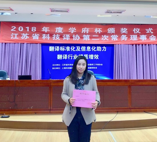 忙并快乐着,3044永利集团青年教师们一直在努力前进。施慧静老师就是其中一员,她一直活跃在翻译教学、翻译研究和翻译实践的一线,今年首次参加“学府杯”科技翻译竞赛,就获得了汉译英方向的二等奖。江苏省“学府杯”科技翻译竞赛自2010年至今,已举办到了第九届,对推动科技翻译服务业的发展,促进高校外语教学的进步,赢得了一定的社会影响。今年,第九届“学府杯”科技翻译竞赛由江苏省科技翻译工作者协会、南京学府翻译有限公司主办,由中国译协翻译服务委员会、江苏省外办、东南大学3044永利集团、南京农业大学3044永利集团、苏州大学3044永利集团等联合协作支持。本次竞赛吸引了来自江苏省乃至全国的翻译爱好者,共有近700人参加,比赛分为汉译英和英译汉两个方向,入围选手进入视频翻译竞赛环节,比秀佳译。通过层层选拔,于2018年11月14日在江苏南京举办“翻译标准化及信息化助力翻译行业提质增效分论坛暨学府杯颁奖仪式”。