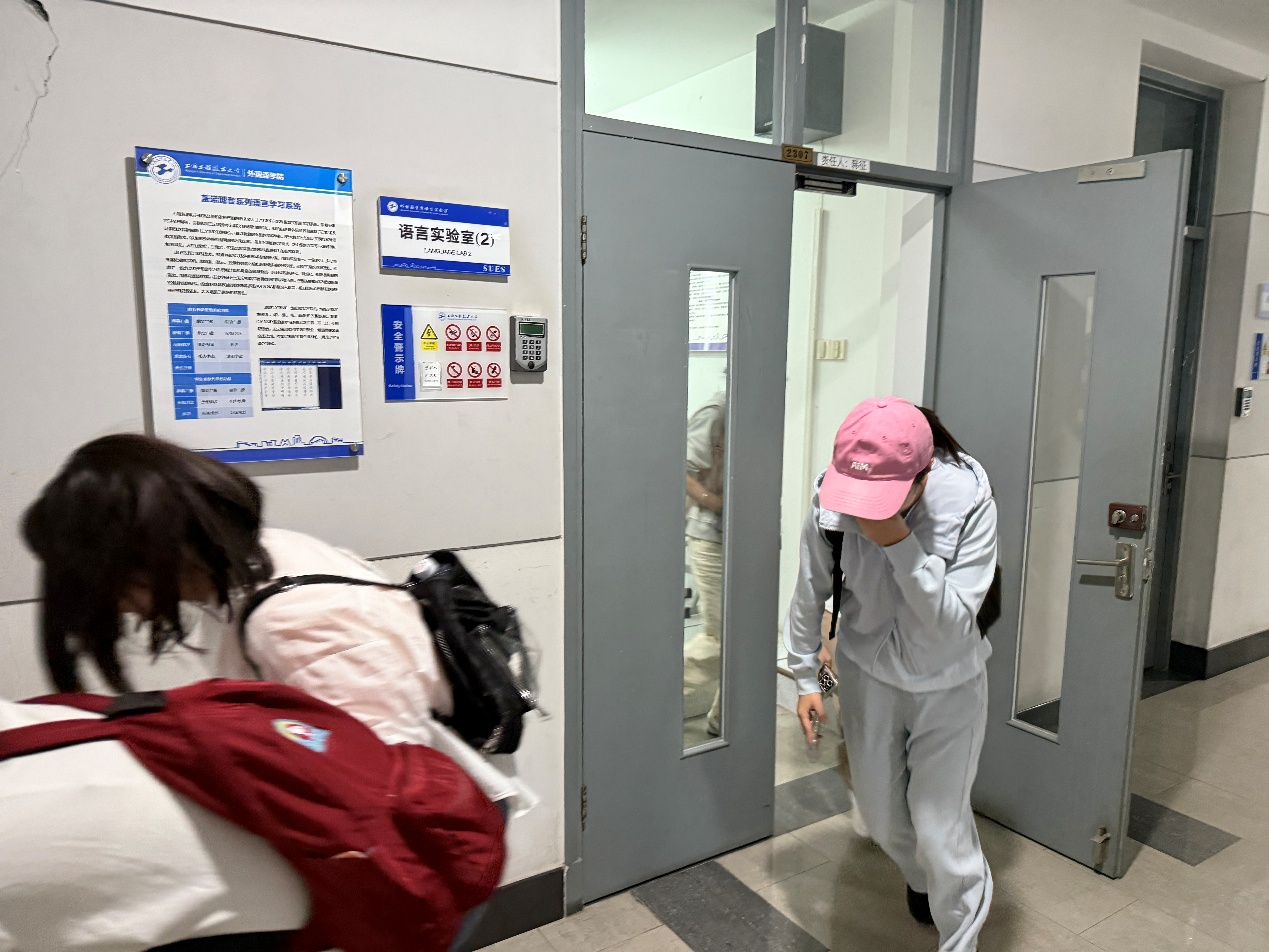演练模拟语言实验室内因电器设备故障引发火情的突发场景。当时,80名员工正在教师指导下开展语言训练。随着警报响起,演练正式启动。实验室教师第一时间切断电源,组织员工捂住口鼻,按照既定疏散路线有序撤离。整个疏散过程紧张有序,师生反应迅速,全部安全到达指定集合区域。