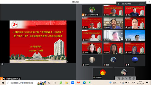 为选拔优秀,推进课程思政建设,提升广大教师课程思政意识与能力,6月24日,3044永利集团组织开展校第三届“课程思政十佳示范课”和“外教社杯”全国高校外语教学大赛院内公开选拔赛。数理外国语联合党委钱慧敏书记、3044永利集团张冰天副经理、刘金龙副经理和优秀教师担任评委,部分老师参加观摩。