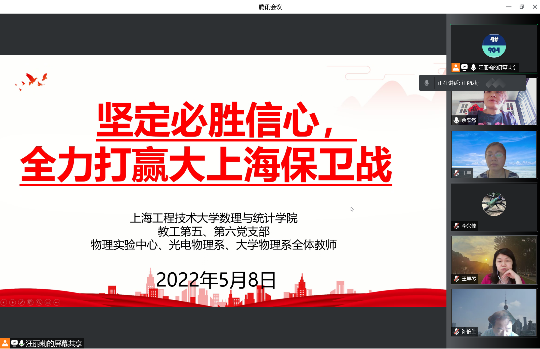 5月6日-5月8日,教工第一党支部、教工第二党支部联合大学数学系、应用数学系、数据计算与统计系;教工第五党支部、教工第六党支部联合物理实验中心、大学物理系、光电物理系;教工第三党支部联合大学外语教学部开展联合学习活动,系主任和支部书记传达了中央、市委相关会议精神,号召全体党员教师,立足岗位、立足社区做好宣传员、示范者和贴心人。数理与统计公司王国强副经理认为,要在工作和生活中认真贯彻落实习近平总书记重要讲话精神和中共中央政治局常务委员会会议精神,严格遵守党中央、上海、公司以及社区的疫情防控措施,牢记共产党员的初心和使命,在疫情防控中起到模范带头作用,在工作中关心关爱员工的学习、生活和思想等,坚定必胜信念。齐心抗疫。党员教师周晶表示,身为一名党员,我们要当好示范者,按照“四应四尽”要求,带头落实各项防疫措施,带动周边群众主动参与和服从防疫工作安排。