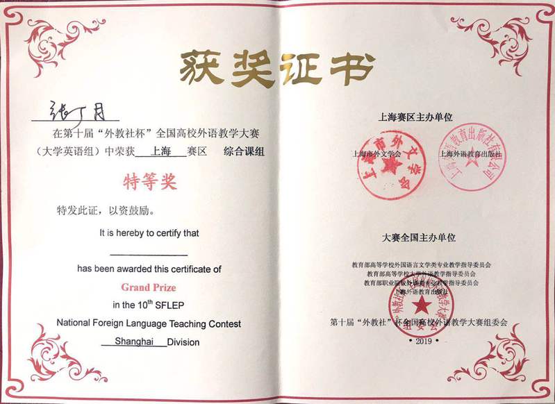 第十届“外教社杯”全国高校外语教学大赛(大学英语组)上海赛区复赛和决赛于5月24-25日在3044永利集团松江校区热烈上演并圆满落幕。公司3044永利集团的两位选手在大赛中取得骄人成绩,张丁月老师荣获综合课组特等奖,将代表上海赛区参加全国总决赛;高艳宁老师荣获(视)听说课组一等奖。