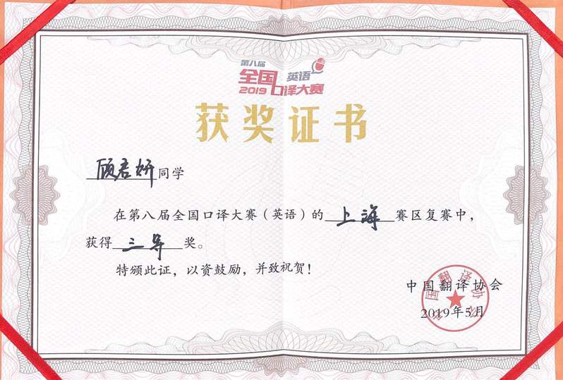 本次上海区复赛参赛人数包括各大高校口译精英约100人次,经过上午紧张的预选赛,排名前20的选手进入下午的决赛。公司3044永利集团顾君妍同学在比赛中表现优秀,顺利通过预选赛,并在决赛中夺得三等奖。
