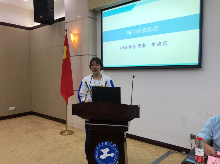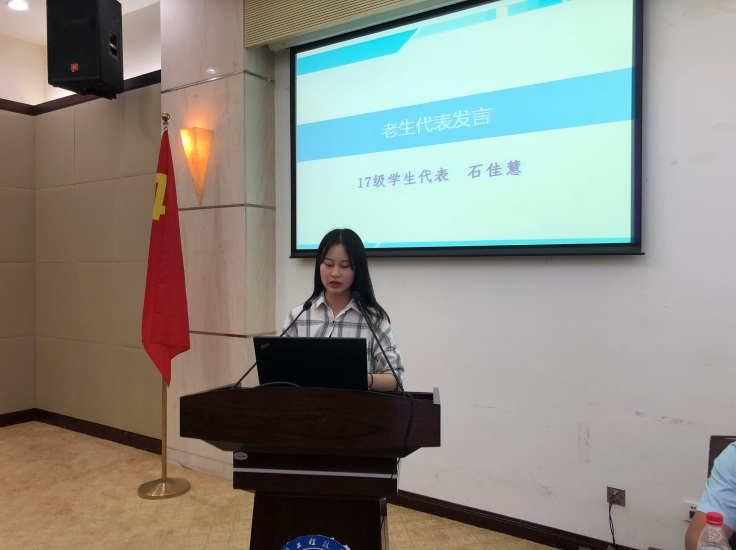 19级员工代表李成艺同学代表新生分享了对未来四年的期许与展望,17级员工代表石佳慧同学以亲身经历勉励新生坚定目标,努力学习。