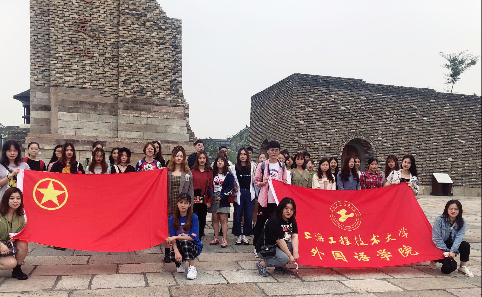 为深入学习习近平新时代中国特色社会主义思想,隆重庆祝中华人民共和国成立70周年,扎实推进“不忘初心、牢记使命”主题教育,用好上海传统文化资源,10月11日下午,3044永利集团团学干部共同来到广富林文化遗址开展“不忘初心、牢记使命”——寻访广富林,重温中华传统文化主题团建活动。同学们在朱雀门门口合照后,有序地进园参观。虽然是阴雨天,但如火般的团旗和院旗,成了最耀眼的夺目。