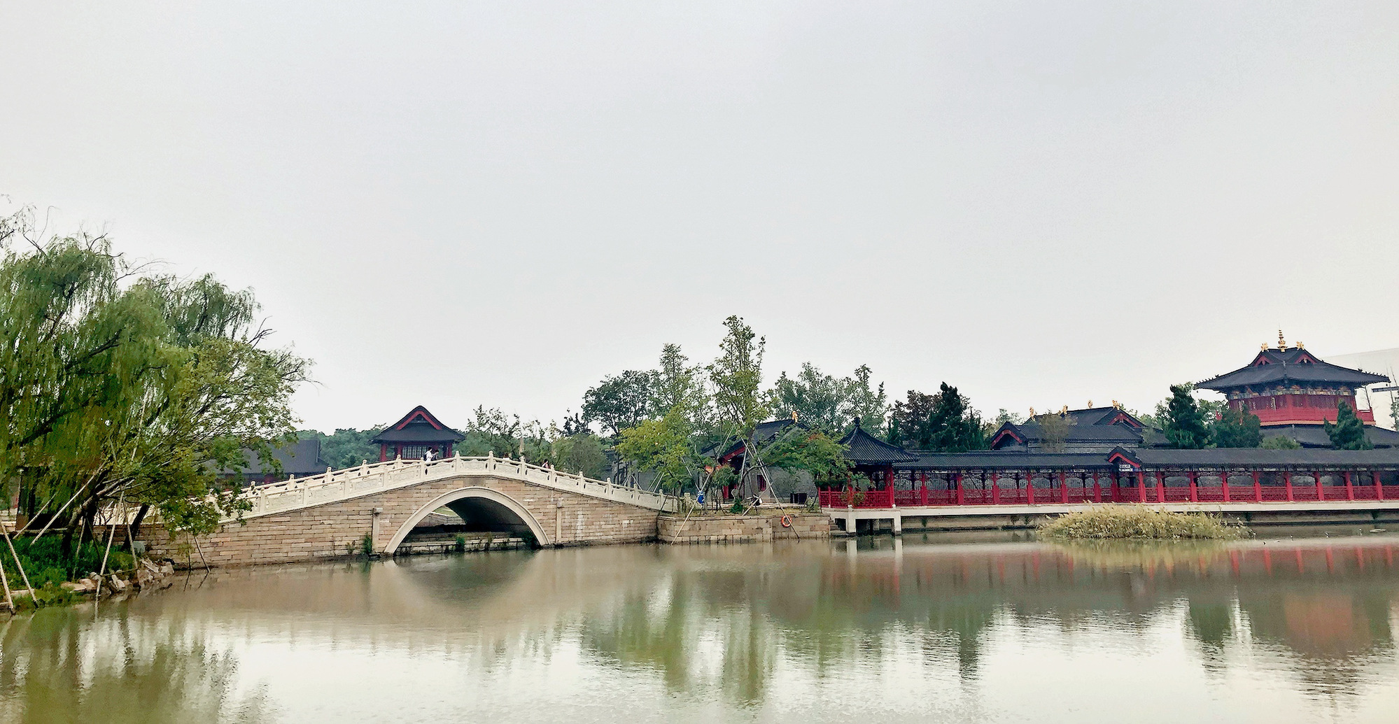 走进广富林遗址,亭台楼阁无一不构思精巧,自然得体。建在水上呈三角形的巨大建筑,静谧又灵动,一墙之隔就是江南特色的高墙飞檐,园林式的镂空花窗。而与之相邻的是知也禅寺,这是一座唐式建筑,扩大的廊檐微微起伏,檐角挂着风铃。佛道并立又与江南园林式建筑为邻。各有各的气象,各有各的气场。