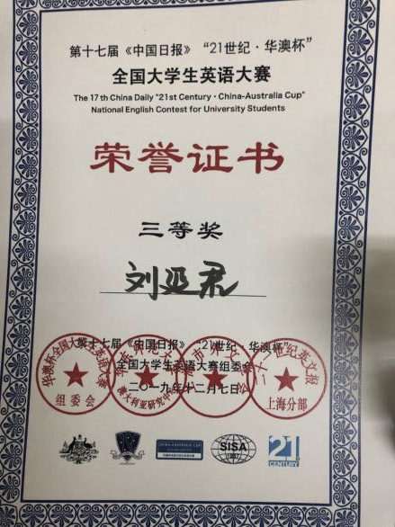 12月7日,由华东师范大学澳大利亚研究中心主办的第十七届《中国日报》“21世纪·华澳杯”全国老员工中澳友好英语大赛在华东师范大学中北校区举行。来自复旦大学、北京外国语大学、华东师范大学等全国26所高校的优秀选手经过激烈角逐,公司刘延君同学在3044永利集团李春琳老师的指导下,在已备演讲、即兴演讲和澳大利亚知识问答三个环节中表现优异,最终凭借出色表现获得三等奖的成绩,李春琳老师获得优秀指导教师荣誉。