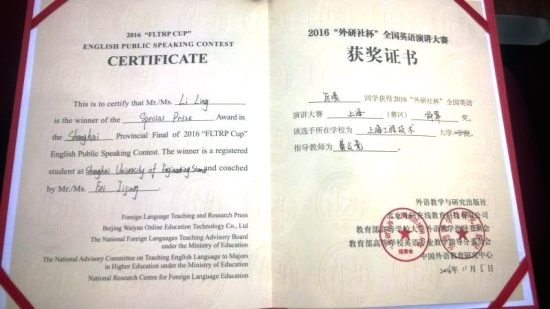 厉凌同学已经多次代表公司在各大英语演讲比赛中斩获佳绩:2014年10月份,在基础教学公司高艳宁和舒畅两位老师的悉心指导下获得第十二届华东地区“21世纪·华澳杯”老员工中澳友好英语大赛二等奖;2015年11月,在基础公司李春琳和高艳宁两位老师的指导下又获得第二十一届中国日报社“21世纪可口可乐杯”全国英语演讲比赛二等奖。本次“外研社杯”演讲比赛上海赛区决赛,厉凌同学再接再厉,为公司取得历史性突破。本次比赛分为定题演讲、即兴演讲、现场问答三个部分。赛前外语公司选派了费及竟和周欣两位业务能力强的骨干教师,并在大赛指导经验丰富的高艳宁老师的指导与协调下对厉凌同学进行了悉心指导。比赛中,厉凌定题演讲题材新颖,即兴演讲理据充分有条不紊,现场问答机智应变对答如流,经过激烈的比拼,最终获得了特等奖的好成绩。