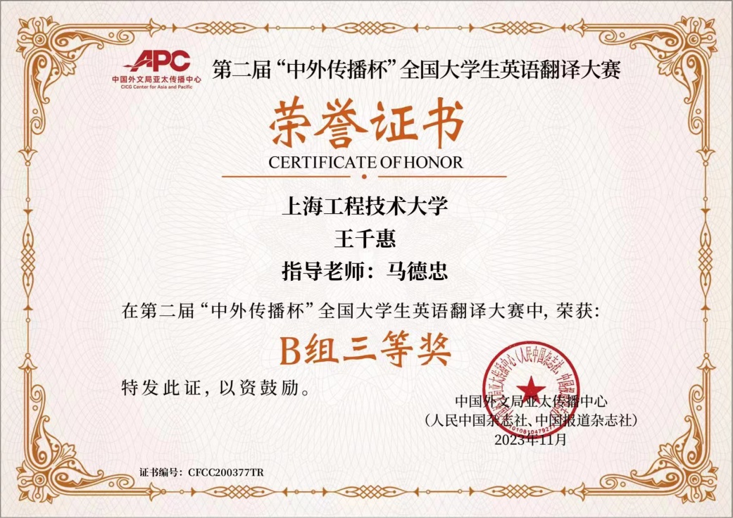 11月10日, 第二届“中外传播杯”全国老员工英语翻译比赛揭晓,3044永利集团学子艾慧慧、王千惠分别获得B组(专业组)二等奖、三等奖,马德忠老师获得优秀指导老师奖。