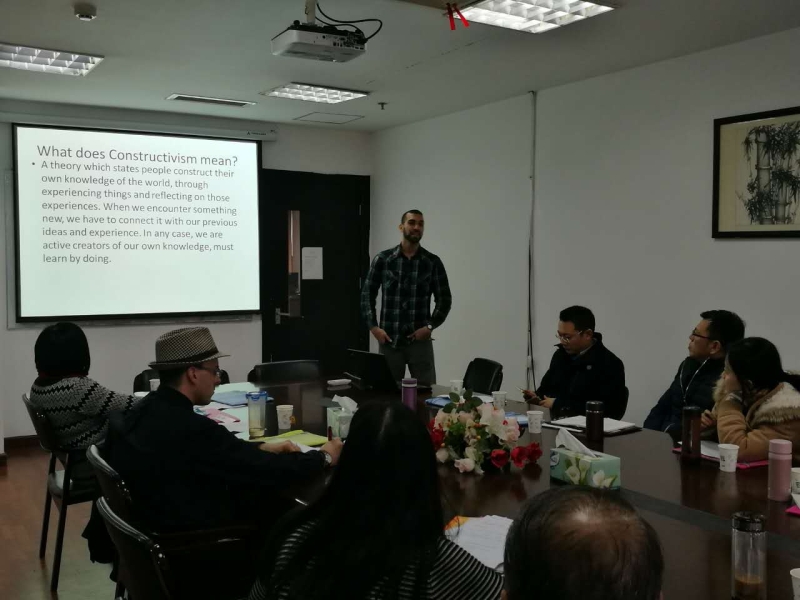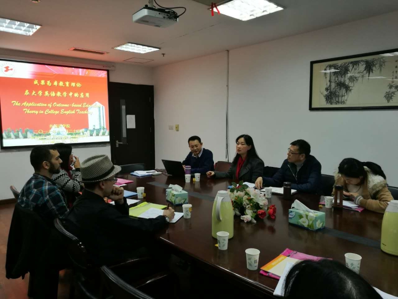 研讨会围绕“成果为本教育理论(OBE)在大学英语教学中的应用”这一主题展开,外教和外语骨干教师做了PPT报告。参会的两位外教分别以How Learner Centeredness Helps和The Role of Constructivism in the Classroom为题,介绍了他们的教学理念和教学方法,并与在场的老师一起模拟“合作学习”活动。盛越老师介绍了他在美国加利福尼亚大学作访问学者的学习经历和收获。在自由讨论环节,外语公司的老师们积极地提出问题,与外教共同探讨英语课堂教学的方法;盛越老师在教育技术方面的研究也引起了外教和外语老师的浓厚兴趣。