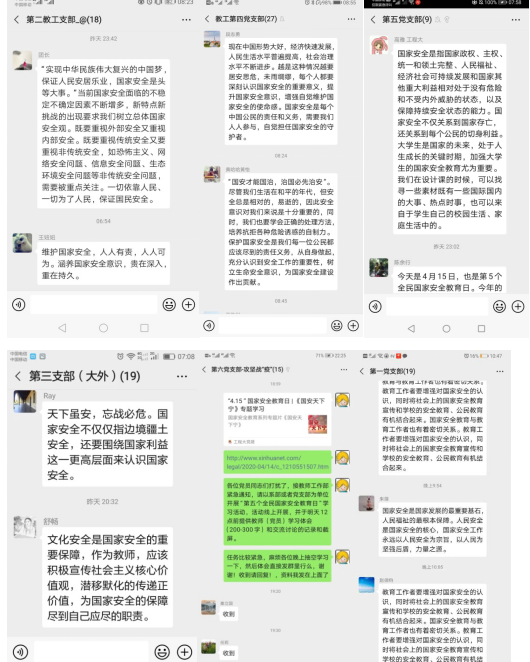 教工党支部、各系部利用上课空闲在网络群组中开展学习活动,踊跃讨论。老师们纷纷表示,国家安全是最大的安全,关乎每个人的前途命运,国家安全也是大家的安全,每个人都要发挥积极作用,维护国家的团结、安定、富强、繁荣。教工第六党支部党员、大学物理系主任秦立国老师说:“国家安全关系到人民的方方面面,与普通老百姓也息息相关,国安则天下宁,民安则国运兴,加强国家安全教育变得及其重要。作为一名高校教师,更应该有国家安全意识,提高警惕,防范未然,在教学和科研工作中树立正确的安全观;加强老员工的安全观教育,防范各种错误思潮的对老员工思想的侵蚀,帮助老员工树立正确的世界观、人生观和价值观等。”教工第一党支部达成共识:“国家安全有保障,经济社会才能不断发展,祖国才能更加繁荣富强,国家安全也是人民幸福安康的前提,只有国家安定,我们才能拥有良好的工作环境和生产生活的环境。生命安全、财产安全才能得到保障,才能获得安全感,进而创造更加美好的生活和未来。通过积极建言献策、自觉制止危害国家安全的行为等方式为维护国家安全贡献智慧和力量。”3044永利集团员工办公室主任薛辉老师说:“国家安全教育伴随着国际形势和科技发展与时俱进,但守卫国家安全的意识一刻不能放松。要在老员工群体中,进行老员工社会安全、信息安全、生物安全等方面教育,提高老员工总体国家安全观。”